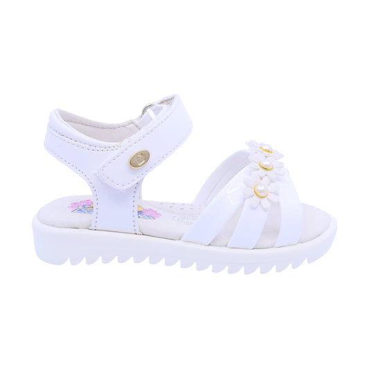 Sandalia Coqueta para niña en charol blanco Rebeca con detalles florales