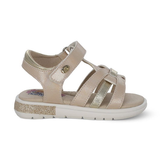 Sandalia Coqueta para niña en sintético beige-oro Cassandra con detalles en oro.