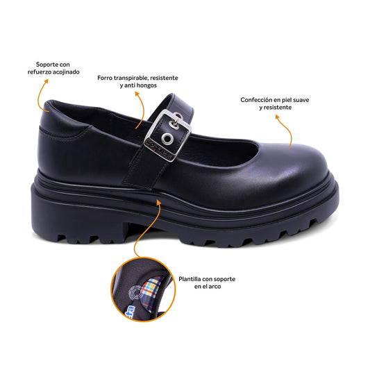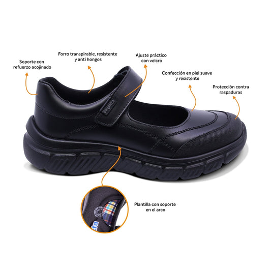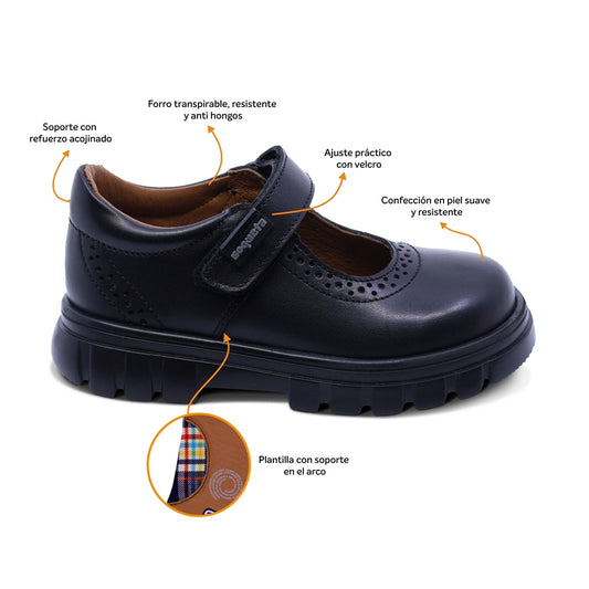 Zapato escolar Coqueta para niña de piel en negro Pilatus con ajuste cómodo