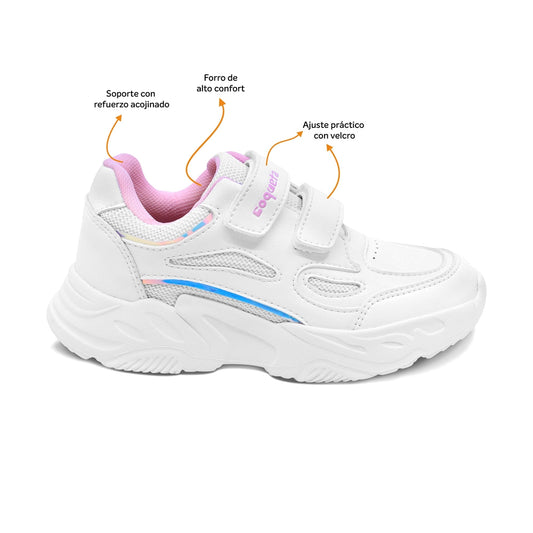 Tenis escolar Coqueta para niña sintético blanco alien con doble tira de contacto