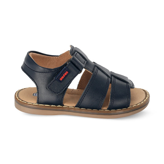 Sandalia Audaz para niño en piel café Patricio con tira de contacto.