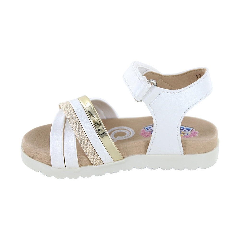 Brillo y comodidad se combinan en esta sandalia Coqueta para niña, elaborada en corte sintético perla con tiras decoradas en dorado y glitter. Cuenta con tira de contacto para fácil ajuste, perfecta para días festivos o looks frescos de verano.