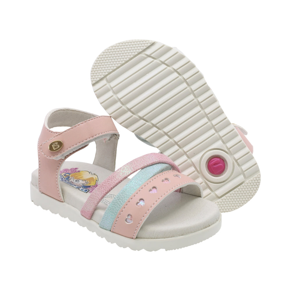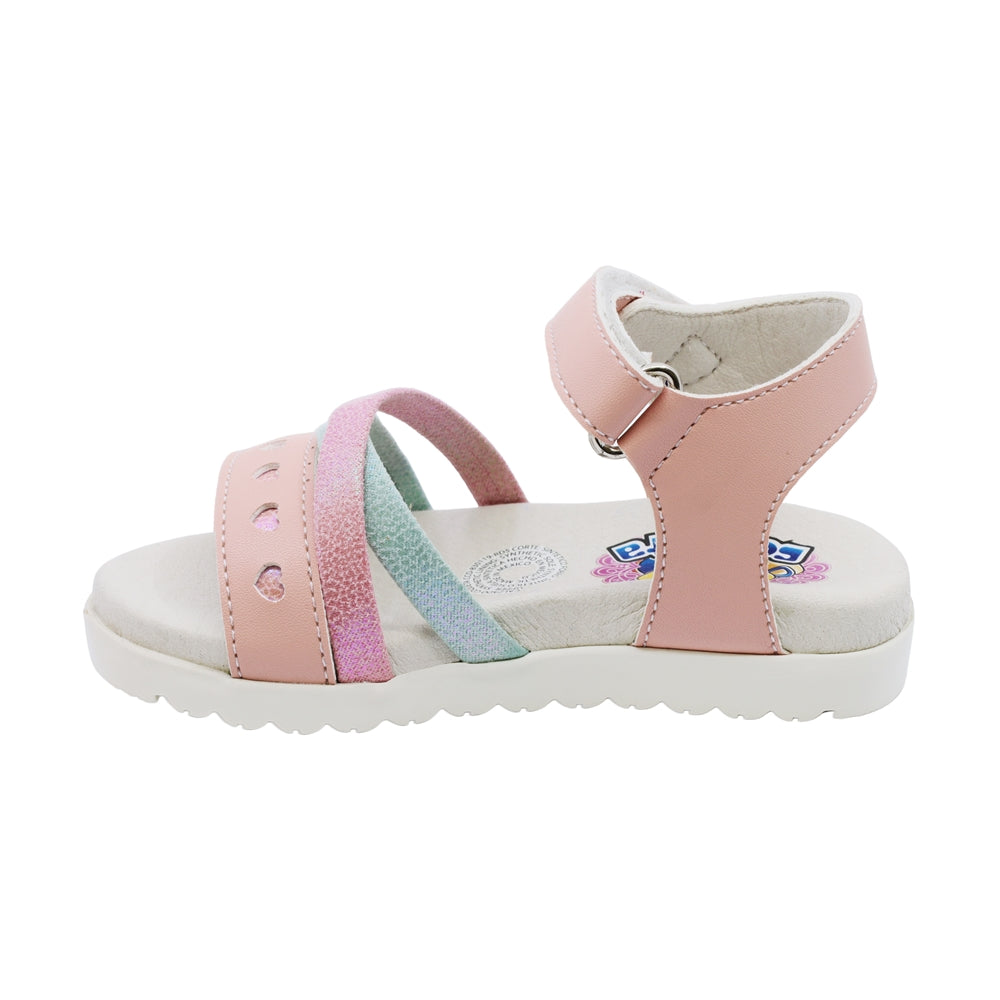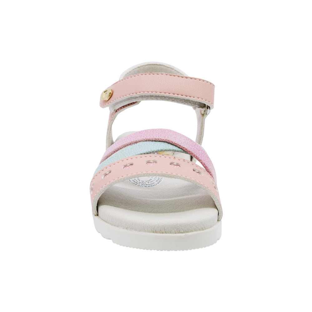 Dulzura y en cada paso con esta sandalia Coqueta para niña, elaborada en corte sintético rosa con tiras en tonos pastel y perforados en forma de corazón. Su tira de contacto permite un ajuste cómodo, ideal para días calurosos y llenos de juego.