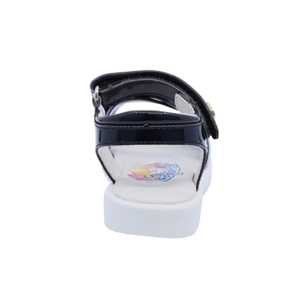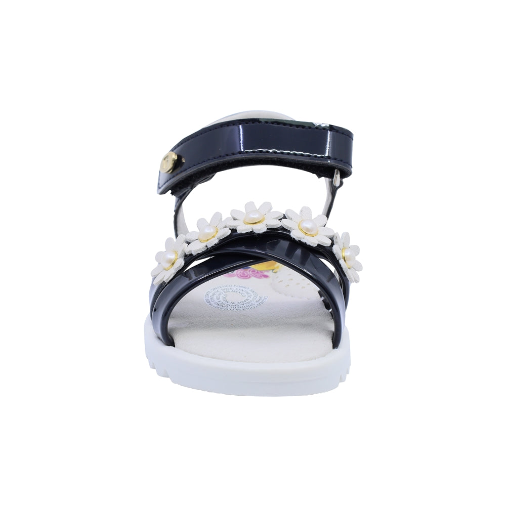 Sandalia Coqueta para niña en charol azul Rebeca con detalles florales