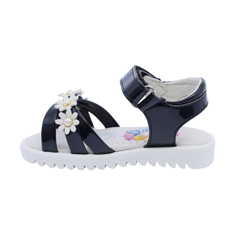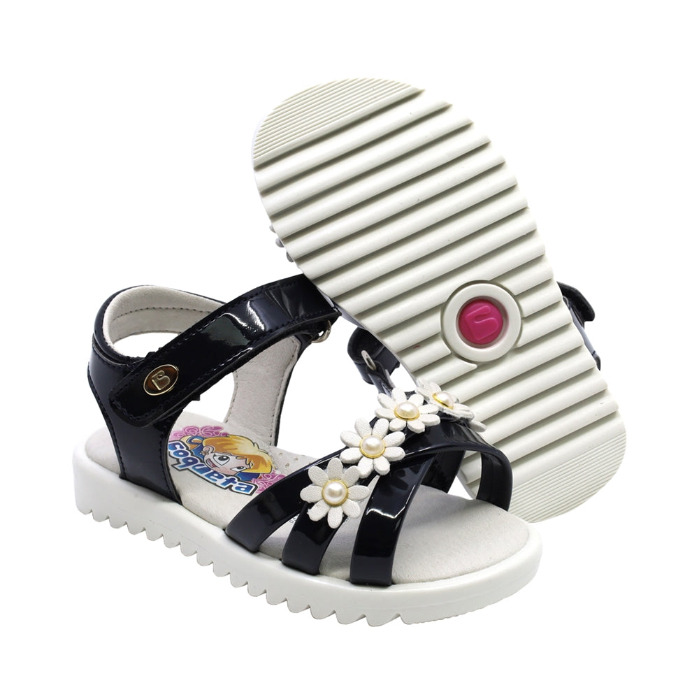 Dale un toque tierno y brillante a su look con esta sandalia Coqueta para niña, elaborada en charol azul con aplicación de flores blancas y perlas. Cuenta con tira de contacto para un ajuste cómodo, ideal para paseos o eventos especiales.