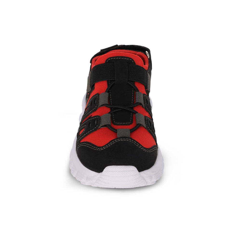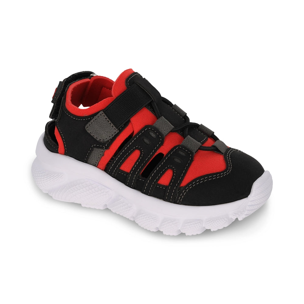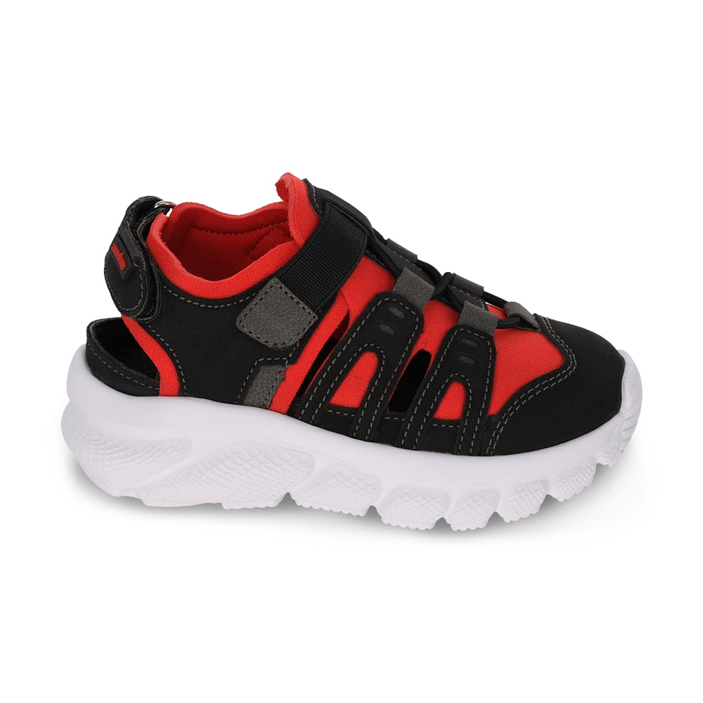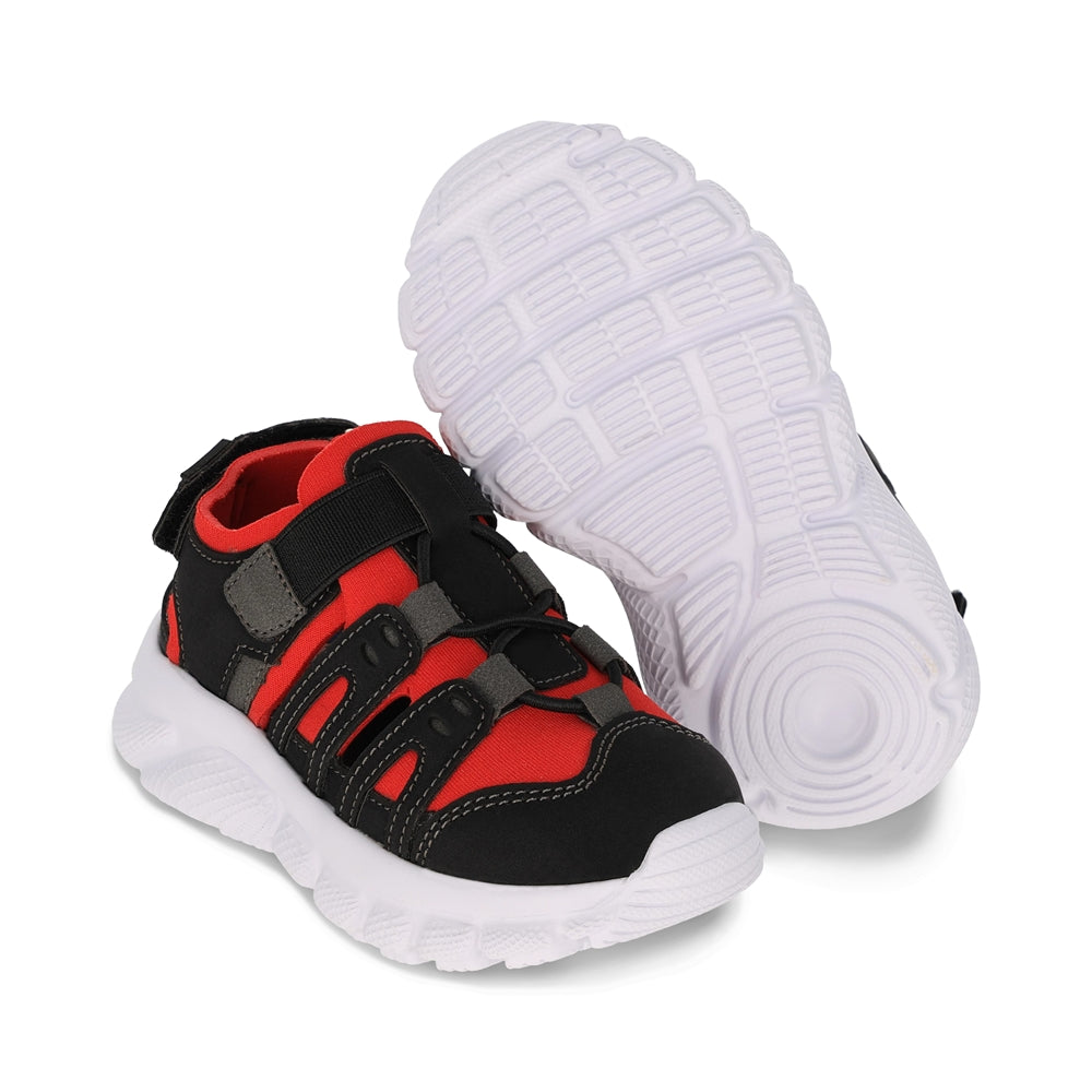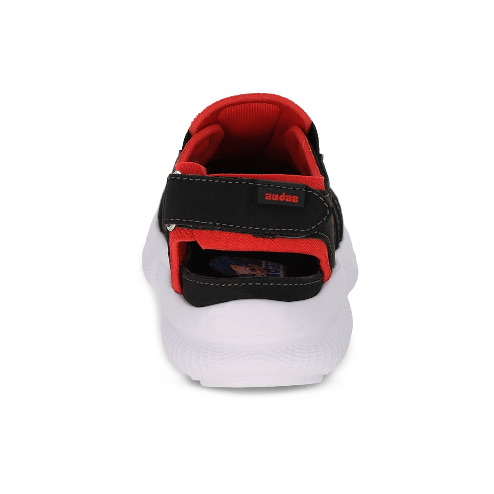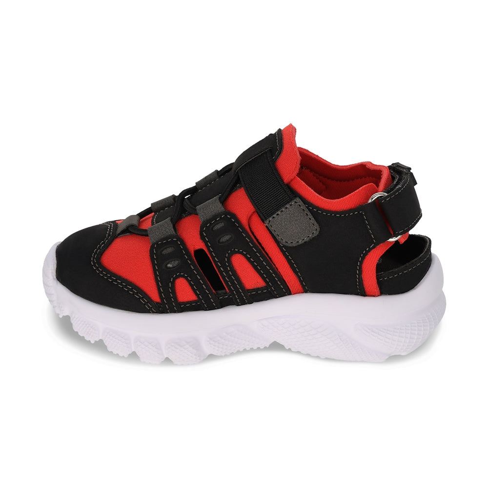 Sandalia Audaz para niño en negro con detalles en rojo hecha de en sintético, cuenta con un ajuste de tira de contacto para mayor seguridad y confort. Su suela ultra ligera y suave ofrece una comodidad excepcional, permitiendo que cada paso se sienta confortable al caminar.