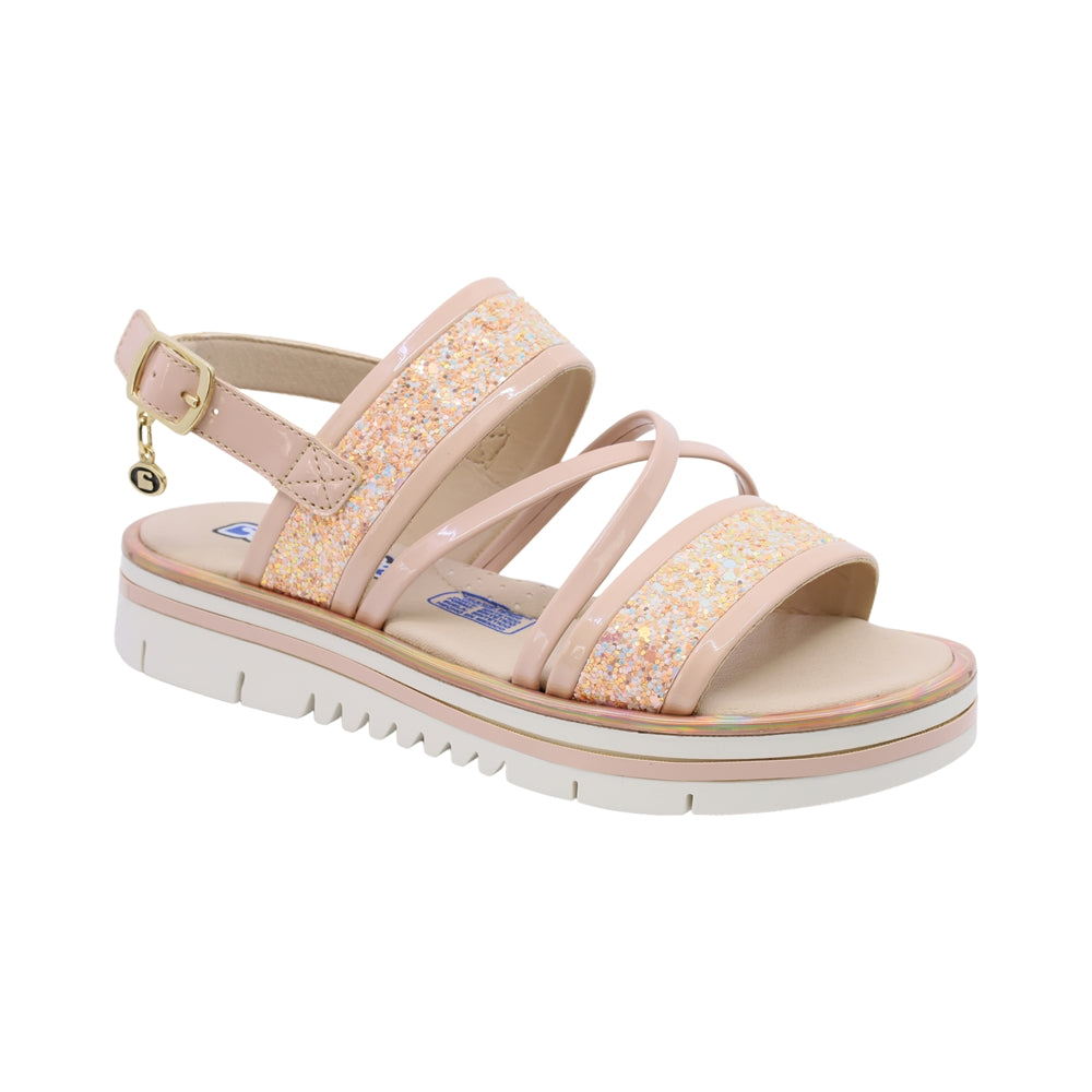Brilla con estilo usando esta sandalia Coqueta para niña, elaborada en corte sintético beige con tiras decoradas con glitter y hebilla metálica con dije. Ideal para eventos especiales, suela dentada que aporta comodidad y seguridad al caminar.