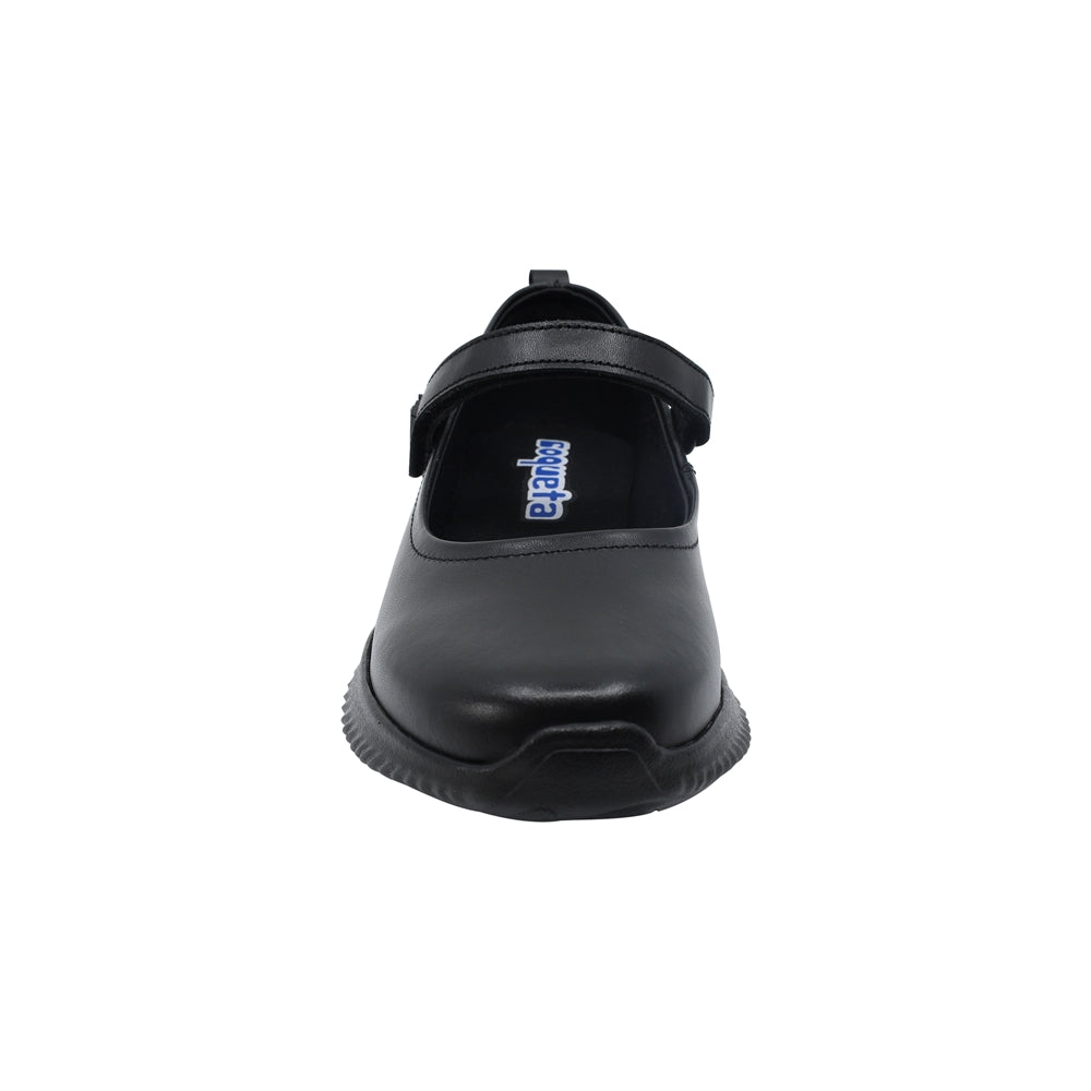Balerinas Coqueta Saturno en negro, fabricadas en corte de piel y transpirables. Su ajuste con correa de tira de contacto asegura un calce perfecto, mientras que la suela antiderrapante le proporciona seguridad en cada paso, evitando resbalones durante sus actividades escolares.