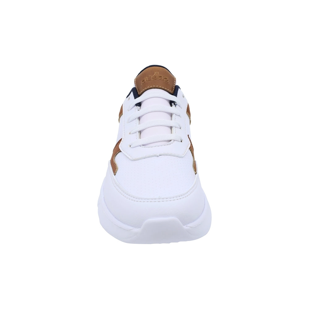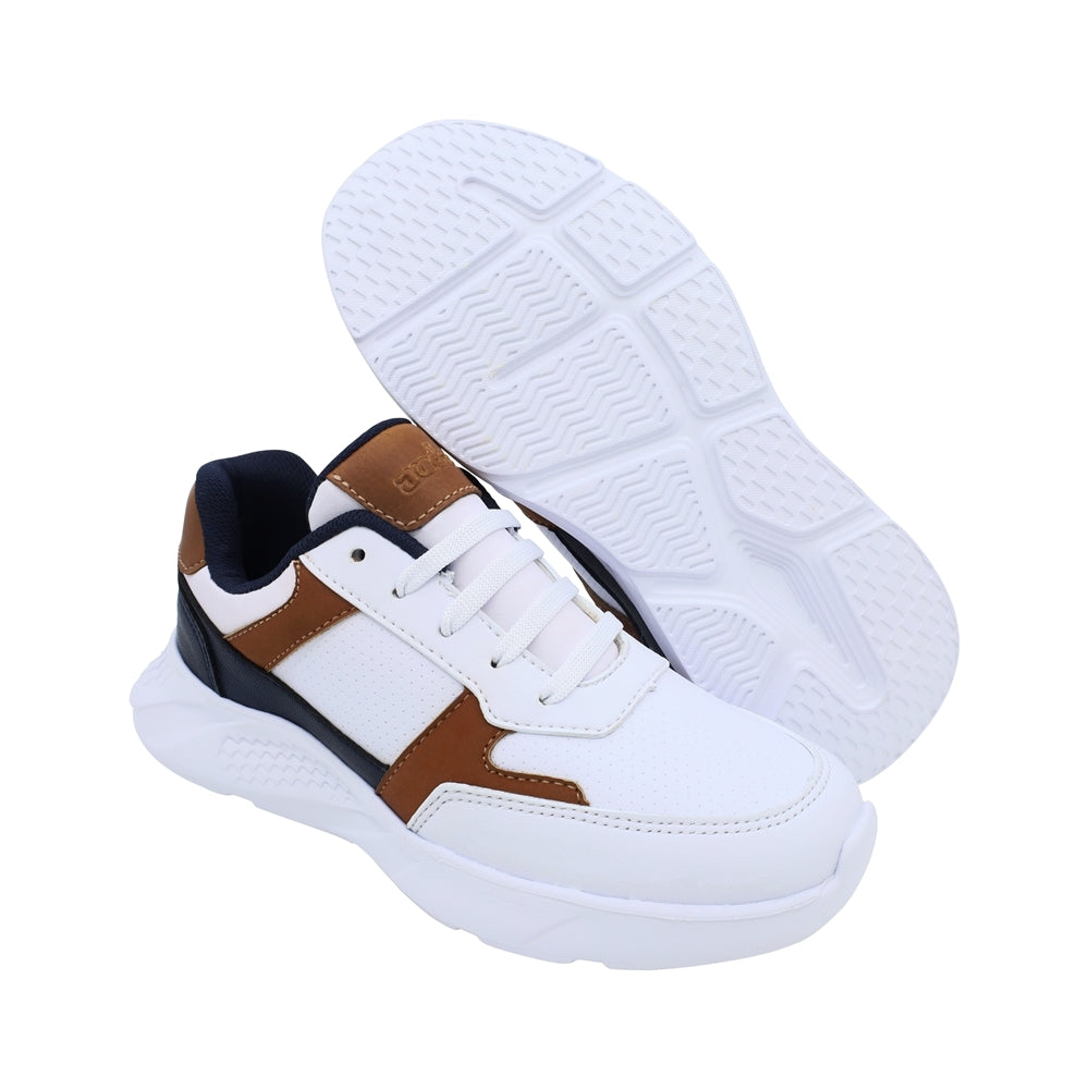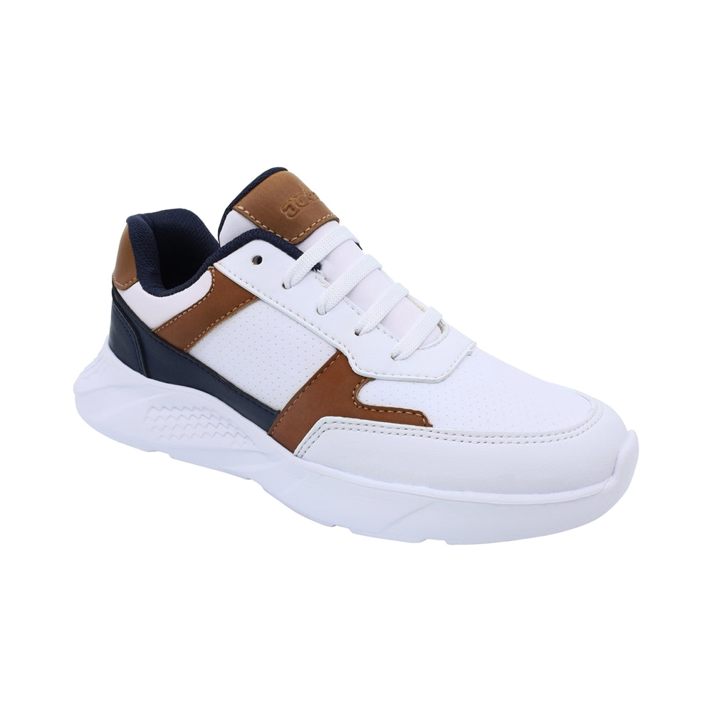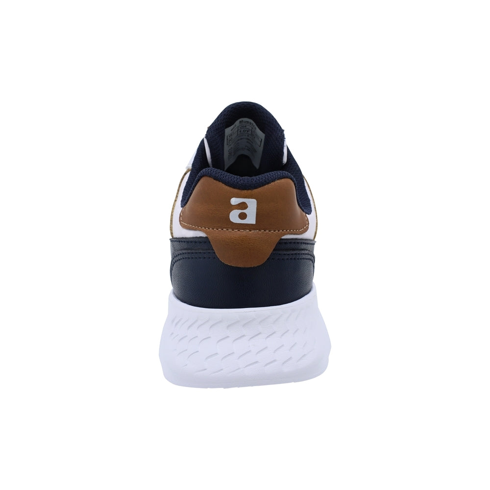 Comodidad y estilo en cada paso con estos tenis Audaz para niño, elaborados en corte sintético blanco con detalles en azul marino y café. Su diseño con agujetas brinda un ajuste seguro para acompañarlo en sus actividades escolares o recreativas.