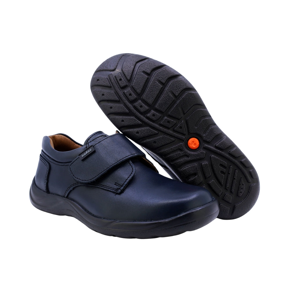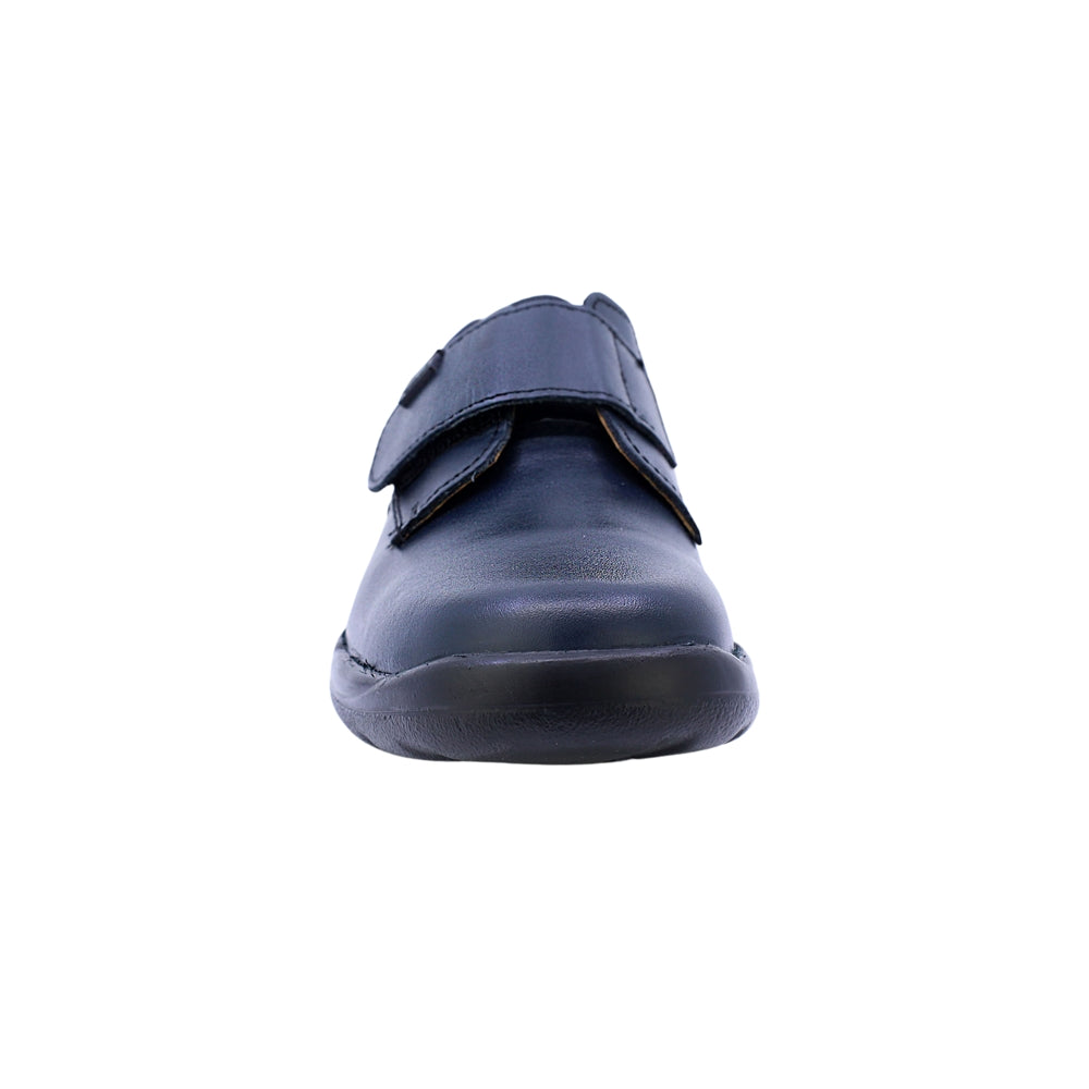 Zapato Escolar Audaz para niño en piel azul marino con diseño liso y elegante. Cuenta con tira de contacto que facilita el calce y suela flexible que brinda confort. Ideal para escuela o eventos donde el estilo clásico y la practicidad se combinan.