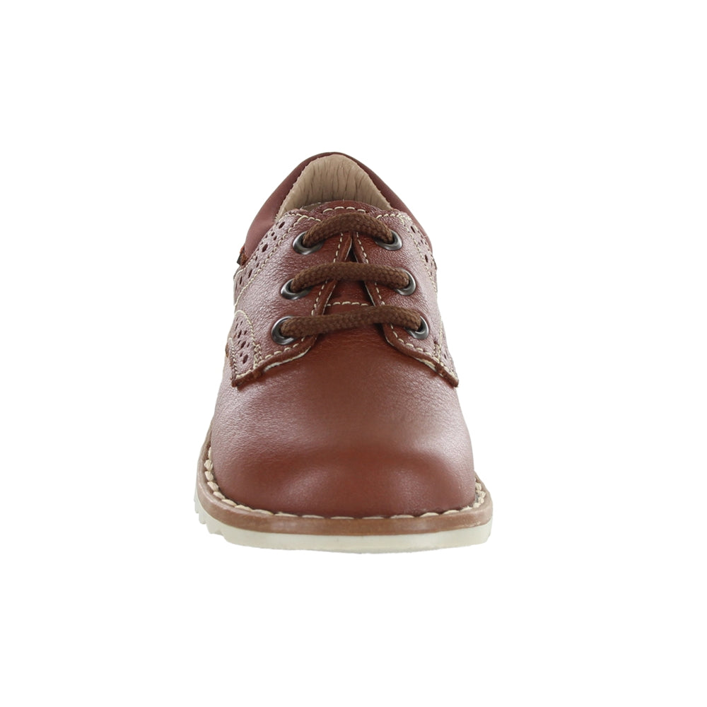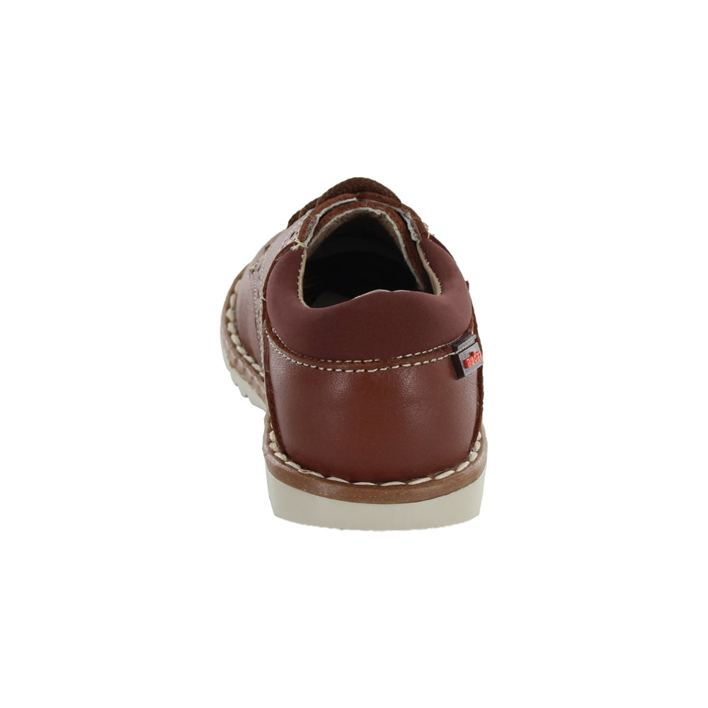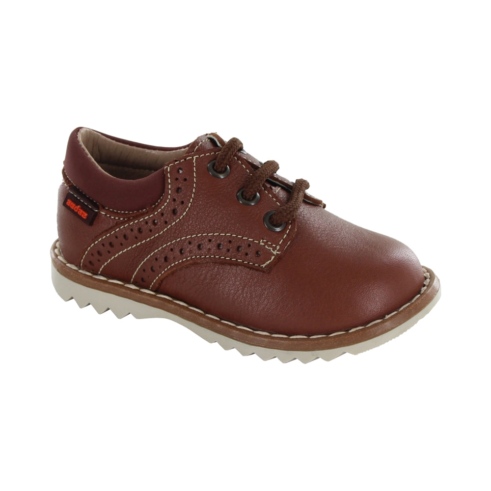 Zapato Audaz para niño en piel café claro con diseño clásico y costuras decorativas. Las agujetas brindan un ajuste firme y seguro, mientras que la suela dentada ofrece tracción y durabilidad. Ideal para ocasiones formales con comodidad garantizada.