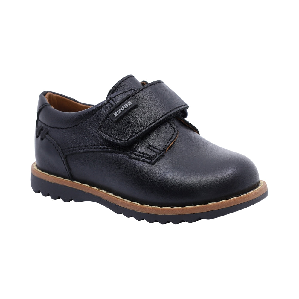 Zapato Audaz para niño en piel negro con tira de contacto que facilita su uso diario. Su suela dentada proporciona estabilidad, mientras que su diseño clásico lo convierte en una excelente opción para uniforme o eventos formales.