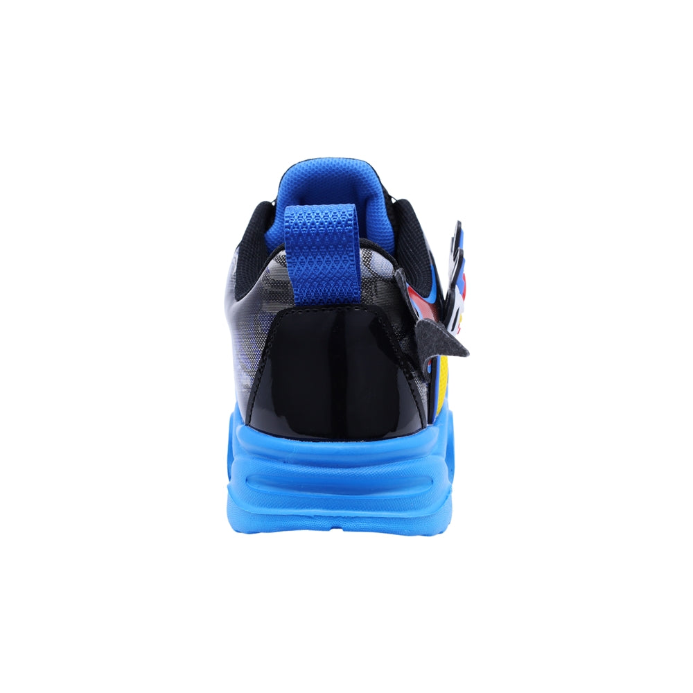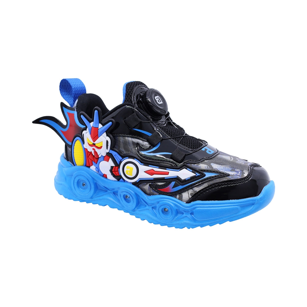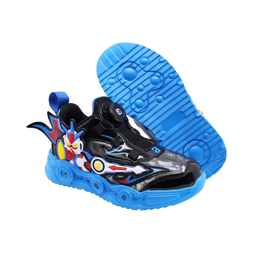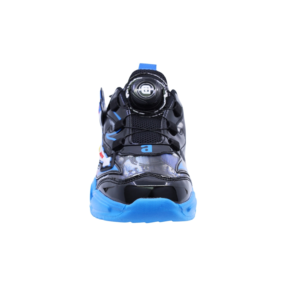 Tenis Audaz para niño en sintético negro con diseño de robot en relieve y luces en la suela. Su sistema de ajuste giratorio y estructura acolchada ofrecen comodidad, seguridad y un estilo divertido para jugar sin límites.