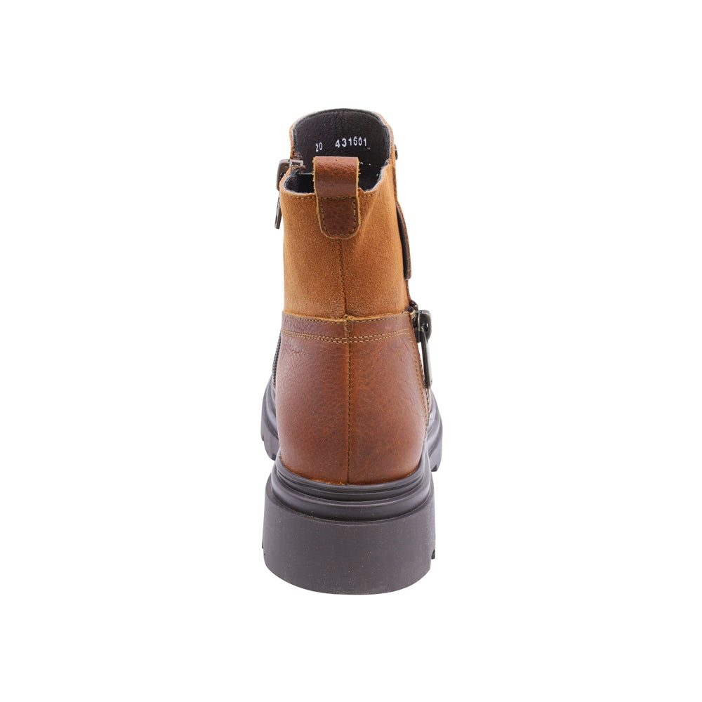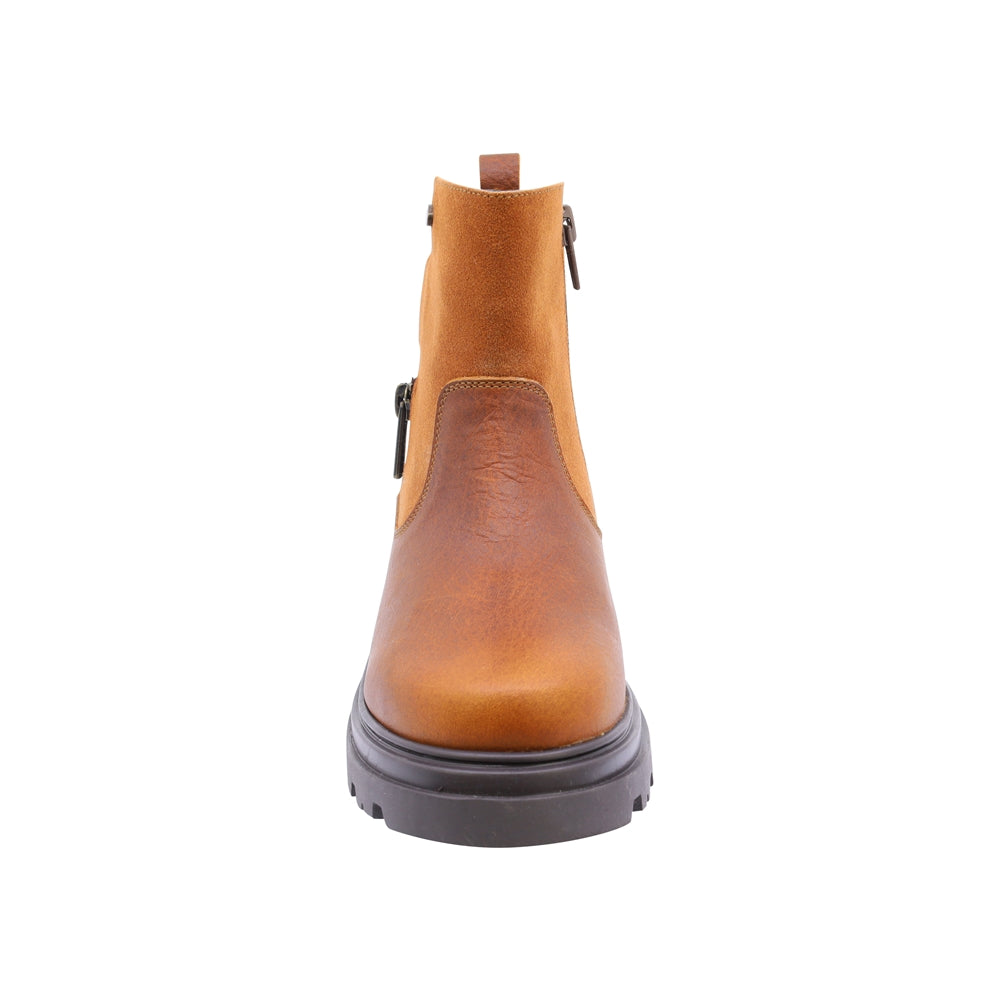 Estilo y funcionalidad se combinan en esta bota Coqueta para niña, elaborada en corte sintético café claro con textura combinada y práctico cierre lateral. Su suela robusta brinda estabilidad, ideal para complementar looks otoñales o casuales.
