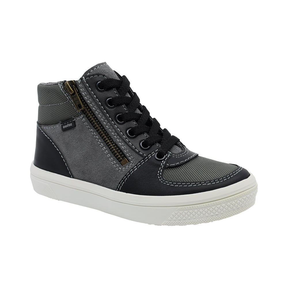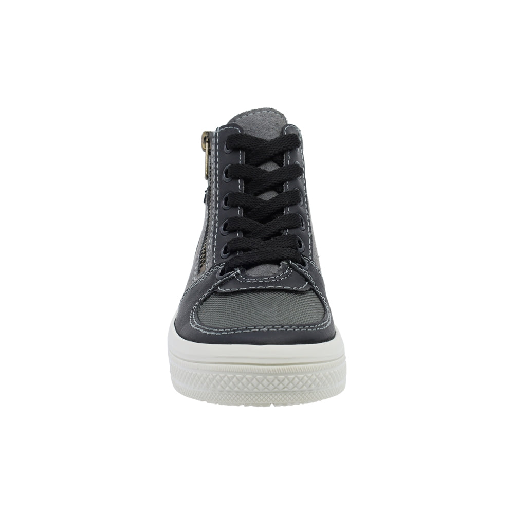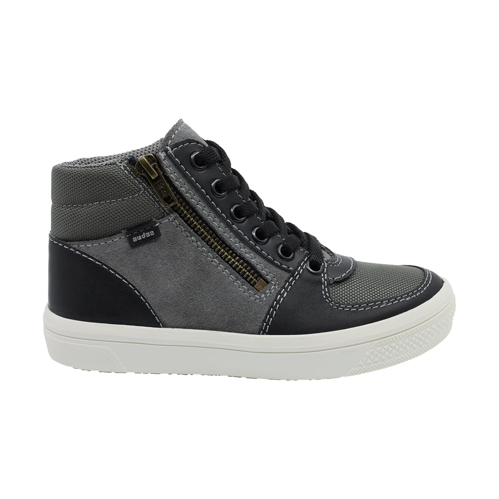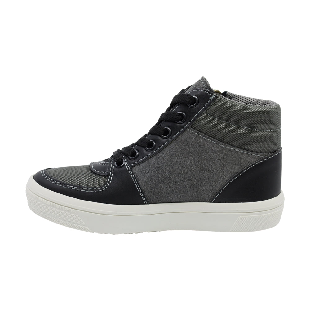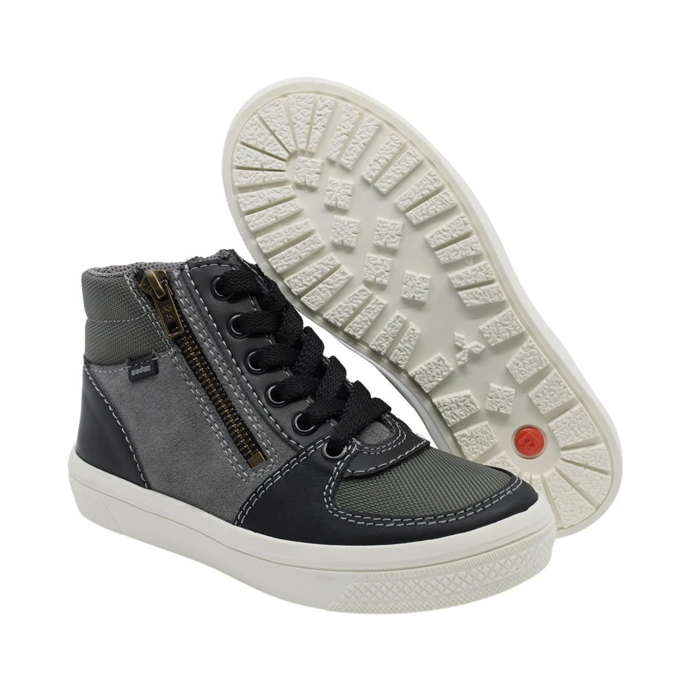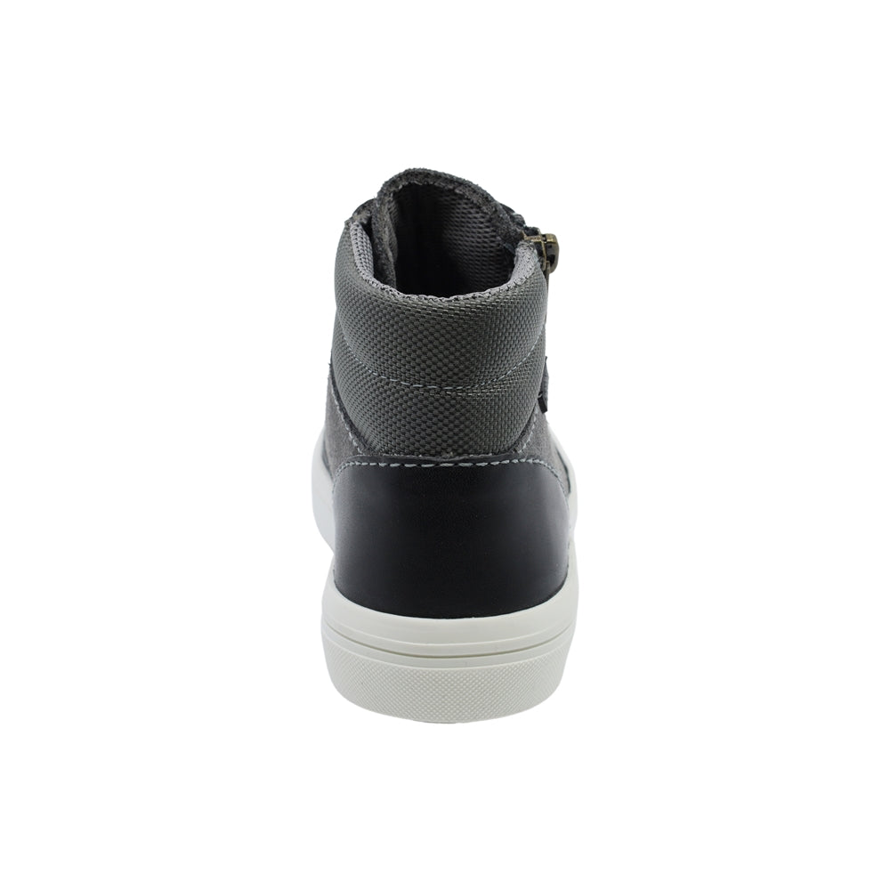 Tenis botín casual en gris con cierre decorativo, confeccionados en de piel con agujeta alta y una suela que ofrece un confort eficaz, son ideales para fiestas familiares y actividades diarias. Perfectos para que tu pequeño luzca estiloso y cómodo.