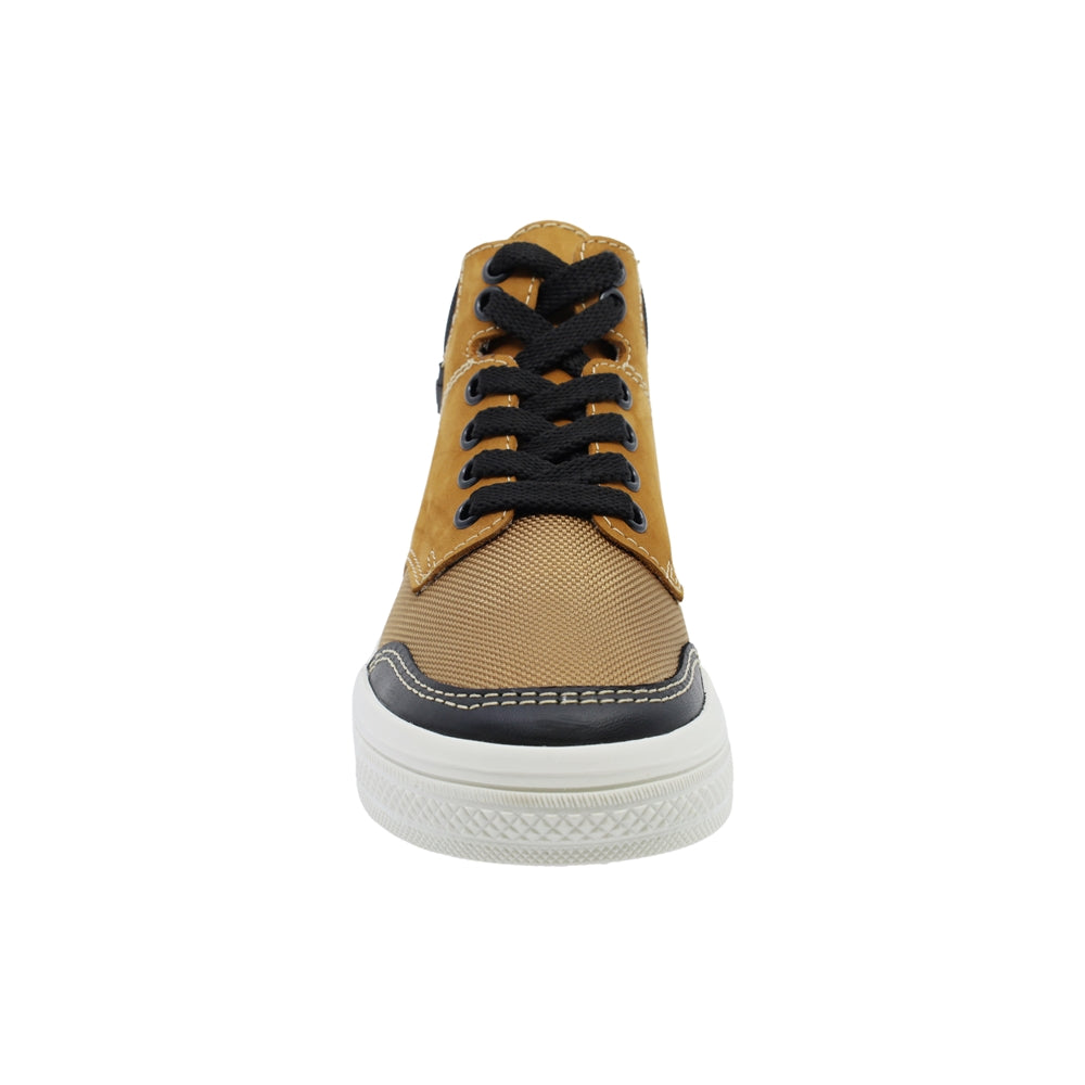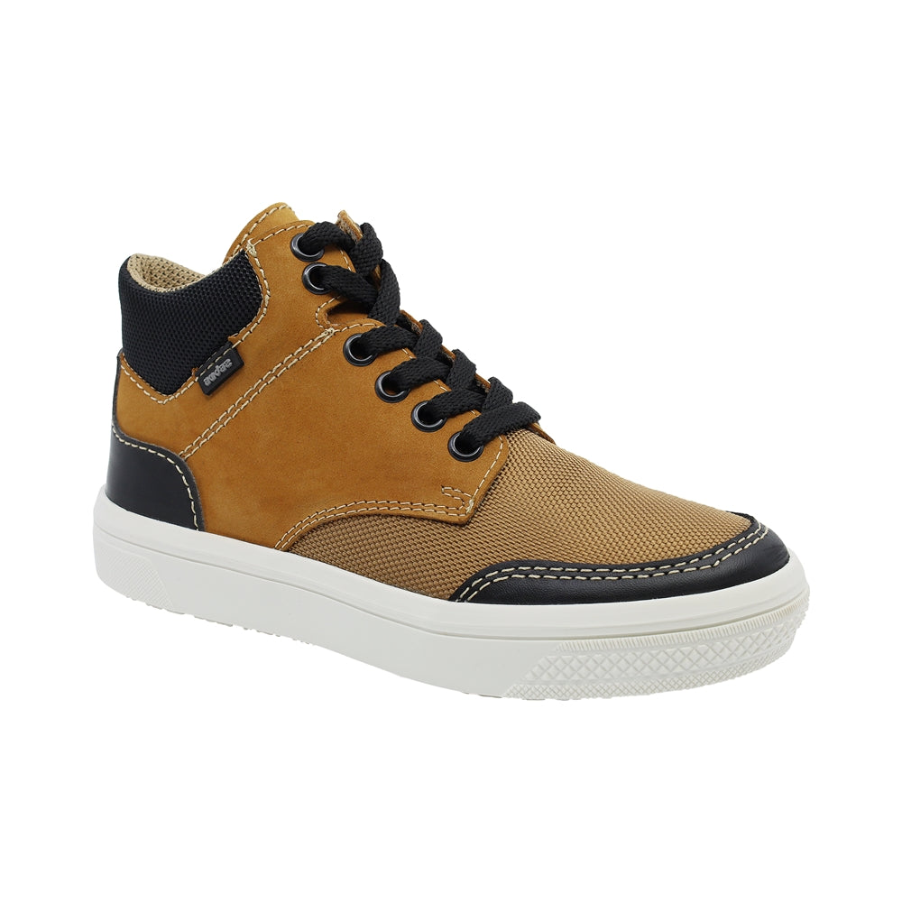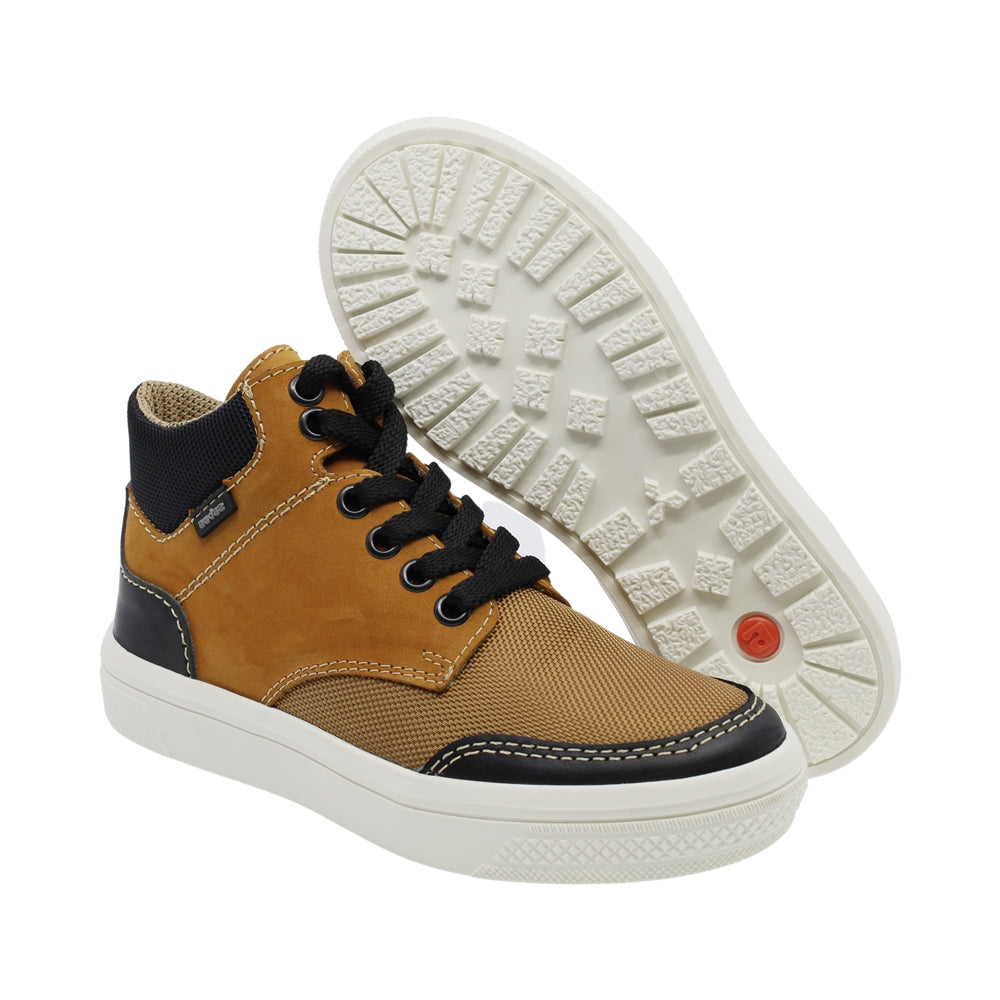 Tenis botín casual en miel, confeccionados en de piel. con agujeta alta y una suela que ofrece un confort eficaz, son ideales para fiestas familiares y actividades diarias. Perfectos para que tu pequeño luzca estiloso y cómodo.