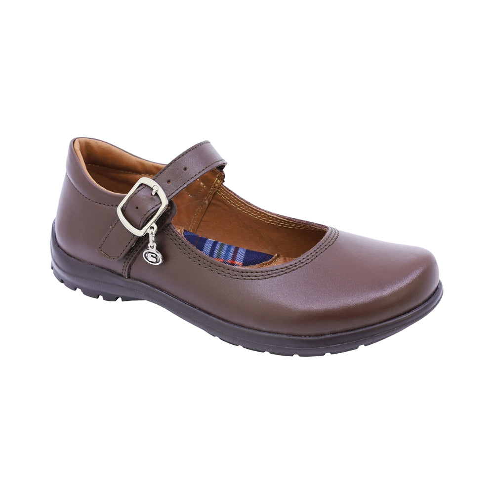 Estilo clásico para ella con este zapato escolar Coqueta para niña, fabricado en piel café, con correa ajustable con hebilla y dije metálico. Ideal para el uso diario con un toque distintivo y femenino.