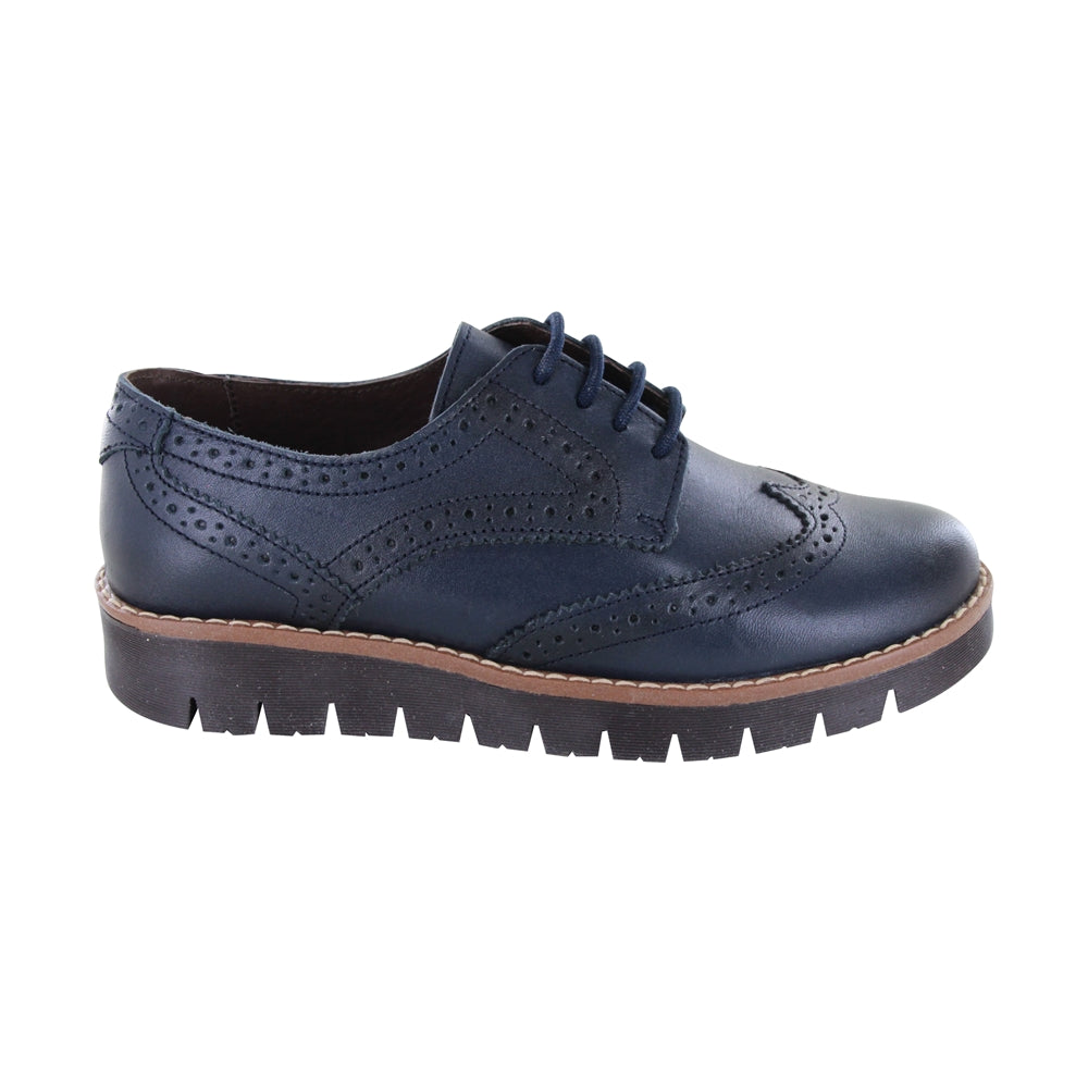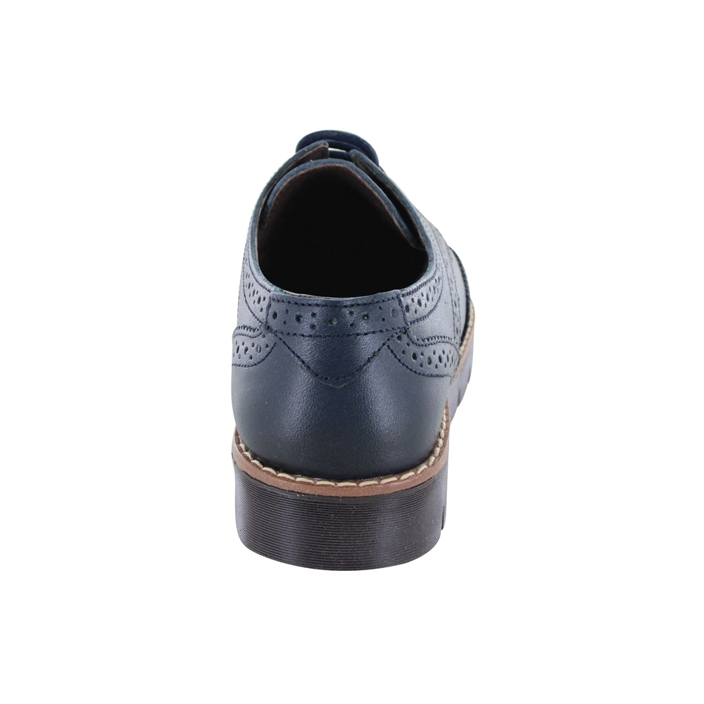Cerrado Audaz para niño en piel azul ofrecen estilo y durabilidad. Su diseño tipo Oxford con detalles troquelados brinda un look elegante. La suela gruesa con acabado bi proporciona estabilidad y confort, ideal para eventos especiales o uso diario.