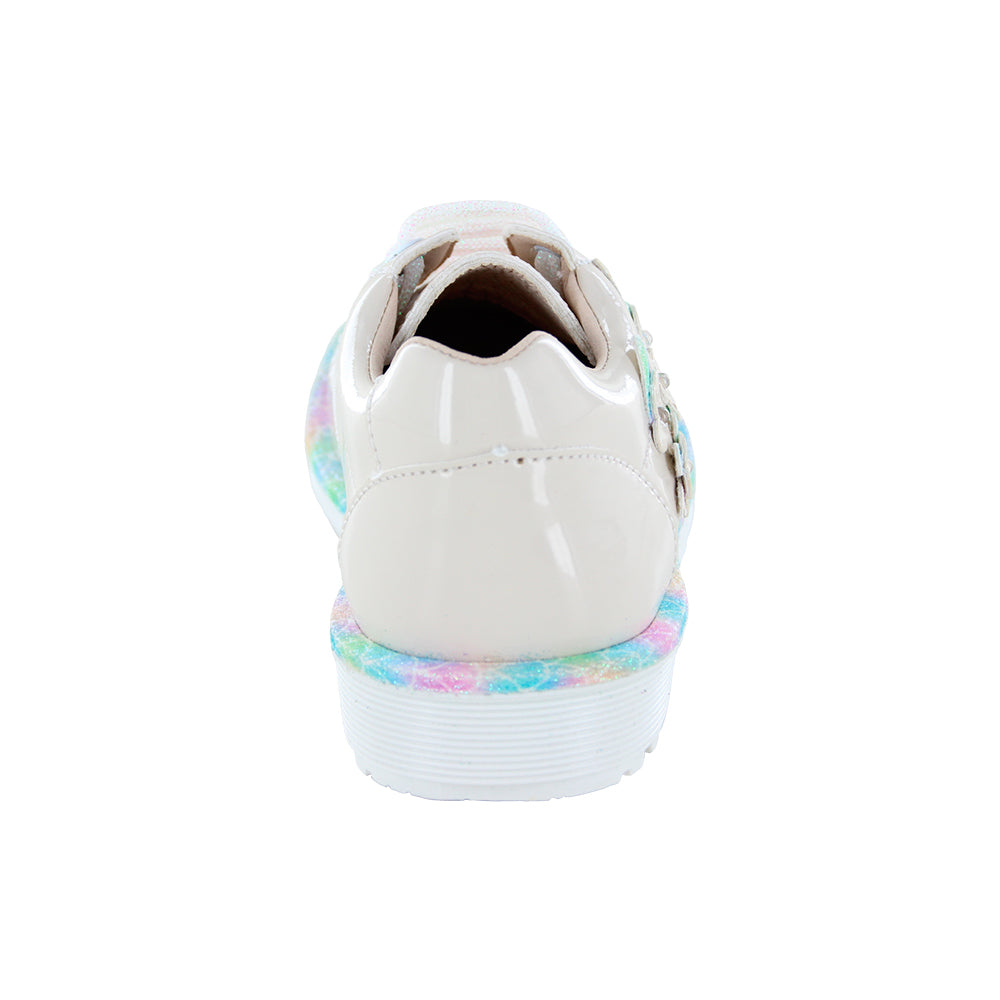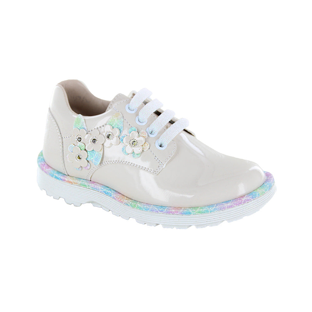 Cerrado Coqueta para niña en charol beige combinan dulzura y estilo. Sus aplicaciones de flores con brillos y su suela multi los hacen únicos. con agujetas y acabado charolado, son ideales para ocasiones especiales o looks encantadores.