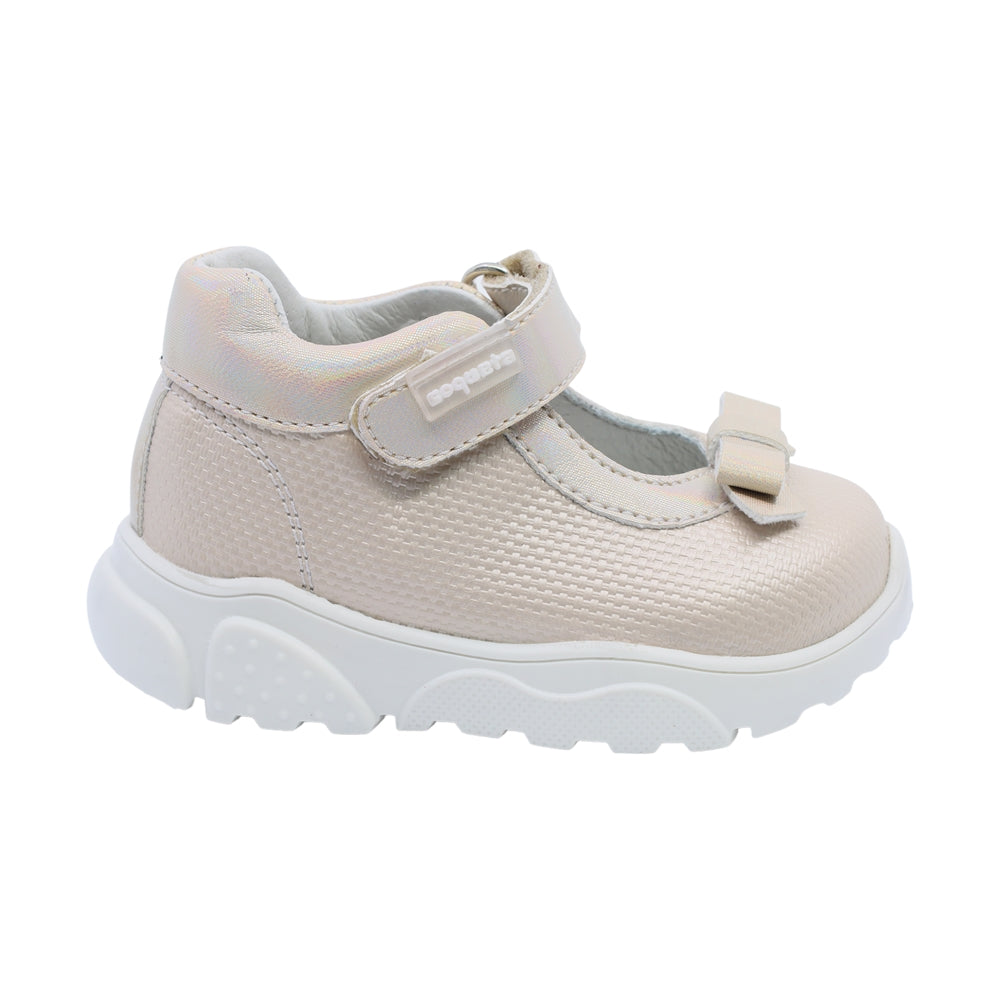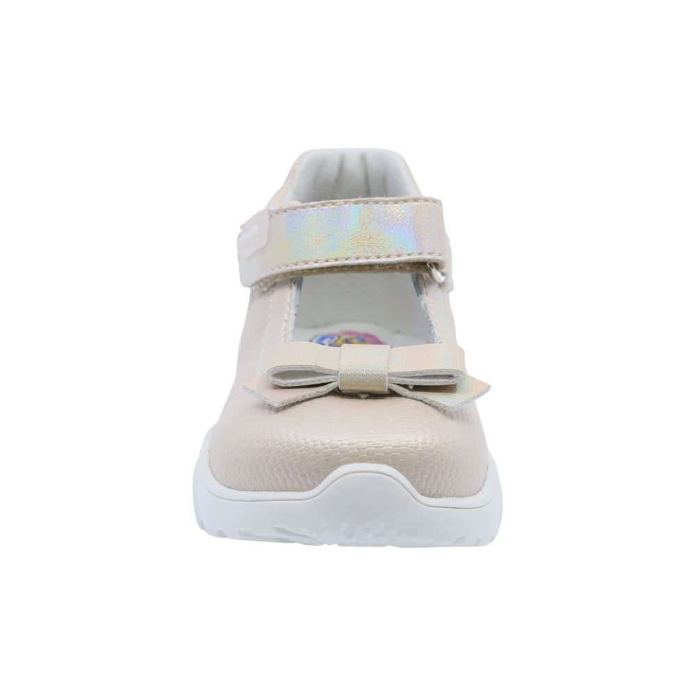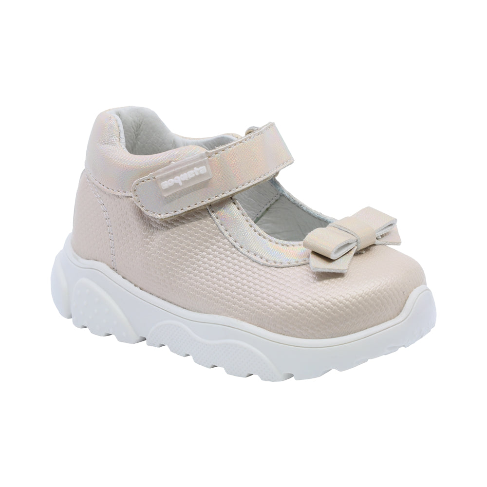 Ternura y confort para sus primeros pasos con este zapato Coqueta para niña, elaborado en corte sintético oro con moño al frente, tira de contacto y suela gruesa que brinda soporte ideal para explorar con seguridad.