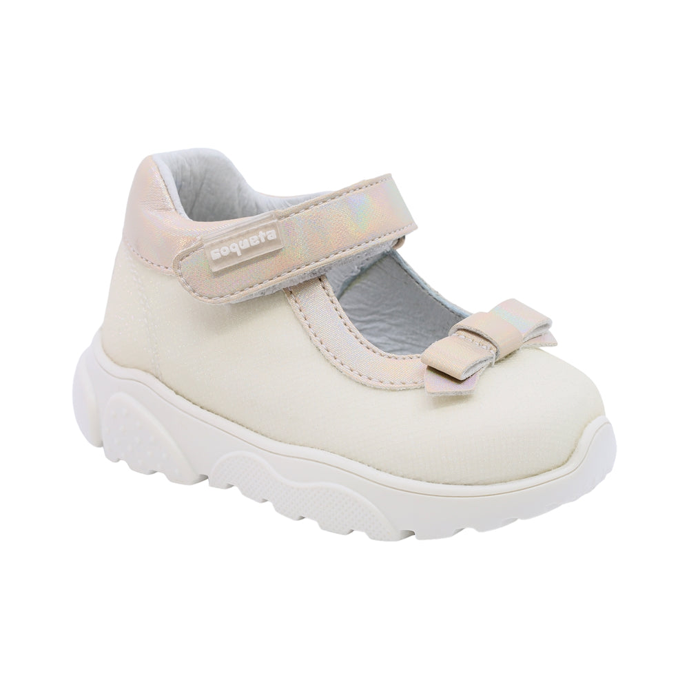 Zapato Coqueta para niña en sintético perla con delicado moño en el frente. Su ajuste con tira de contacto y acabado tornasolado lo hacen perfecto para ocasiones especiales, combinando suavidad, confort y un toque elegante.