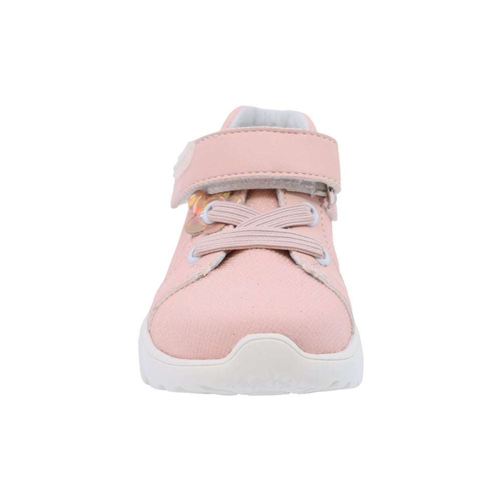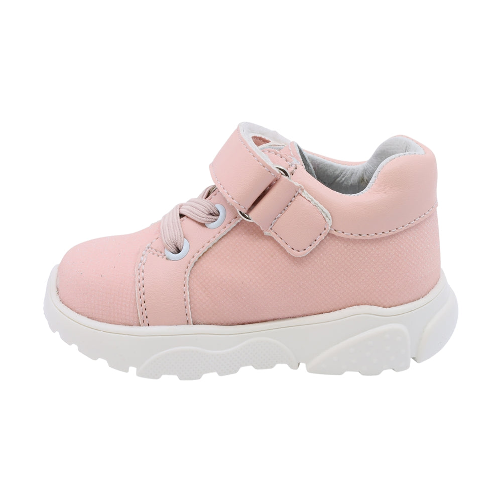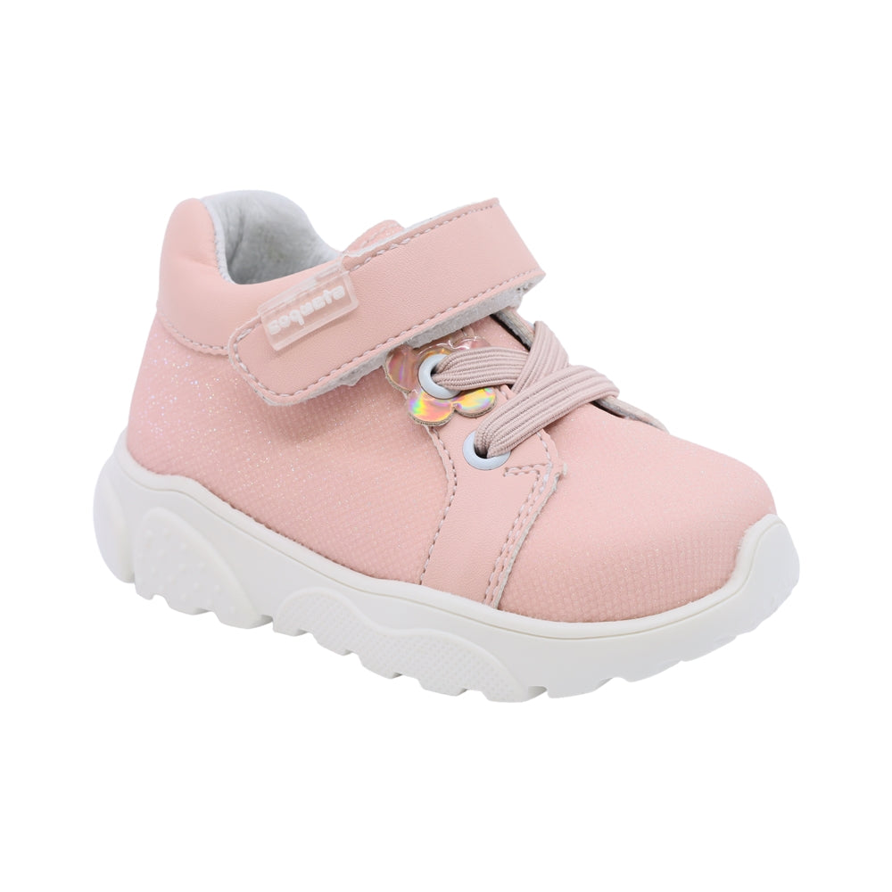 Tenis Coqueta para niña en sintético salmón con detalle de flor en el empeine. Cuenta con tira de contacto y agujetas elásticas, además de una suela ancha que proporciona soporte ideal para los primeros pasos con estilo.