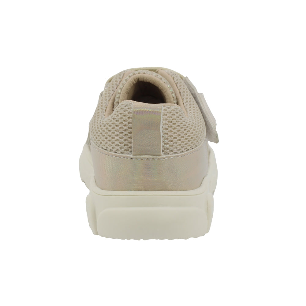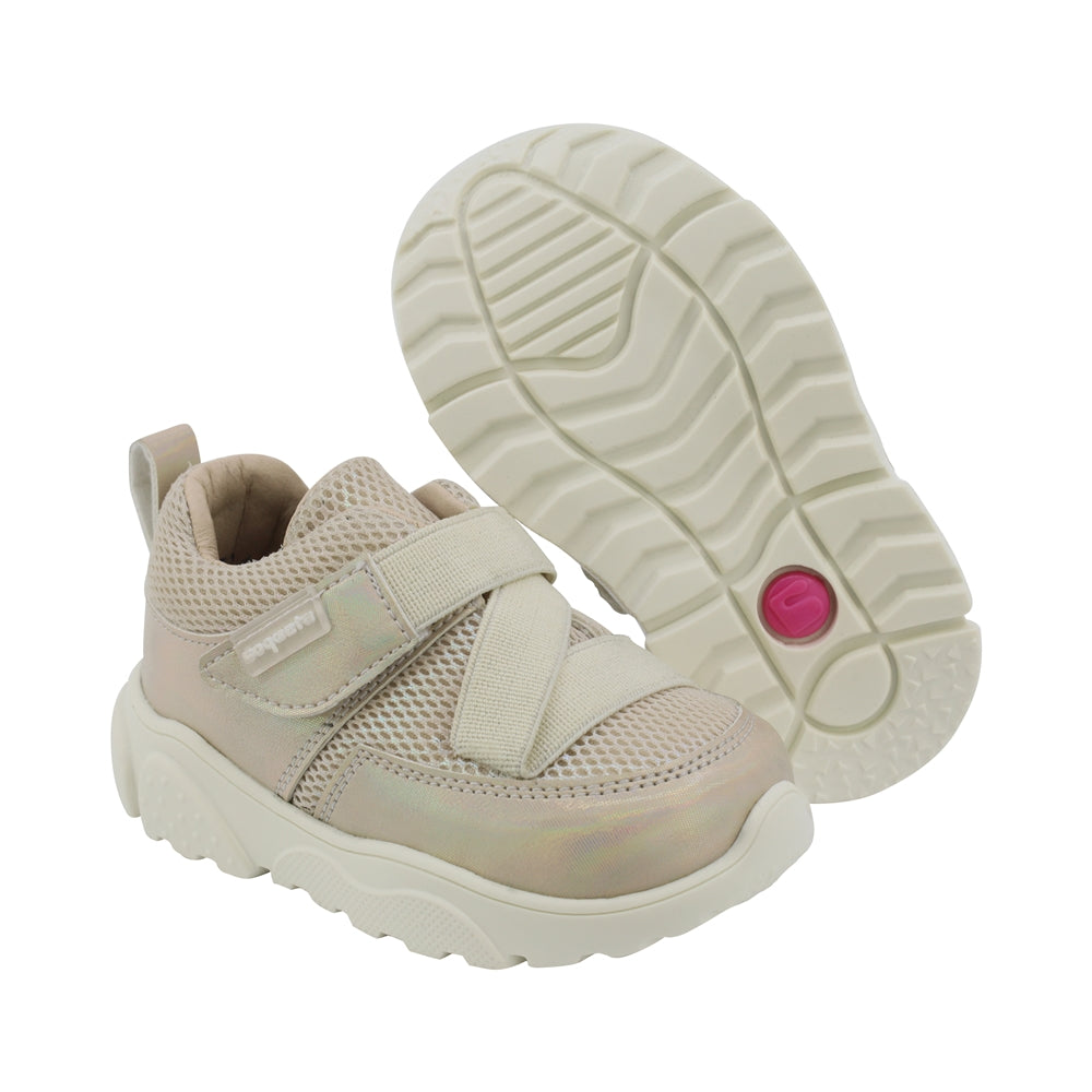 Tenis Coqueta para niña en sintético oro con elástico cruzado como atributo principal. El textil tipo malla permite frescura, y su tira de contacto asegura un calce fácil y seguro en cada paso.
