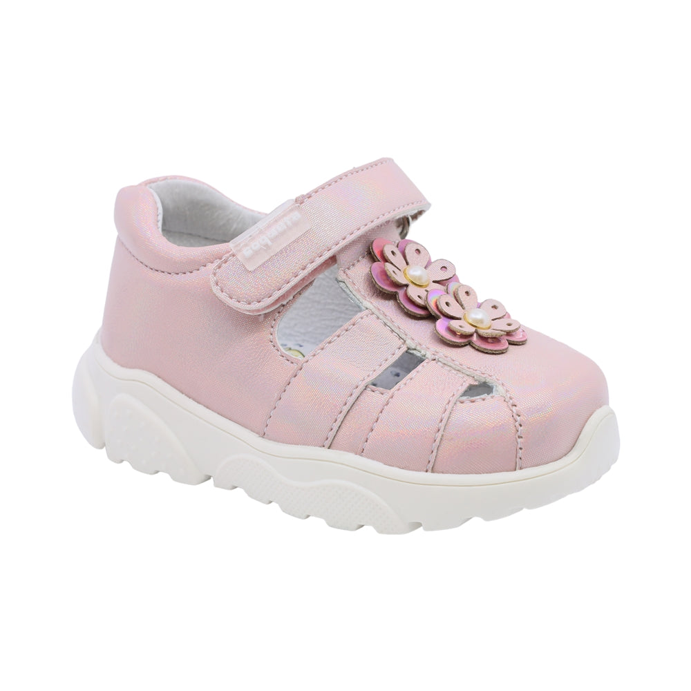 Sandalia Coqueta para niña en sintético oro con detalle de flores bordadas con lentejuelas. Su tira de contacto permite un ajuste práctico y seguro, mientras que su diseño fresco y brillante lo hace ideal para ocasiones especiales o uso diario.